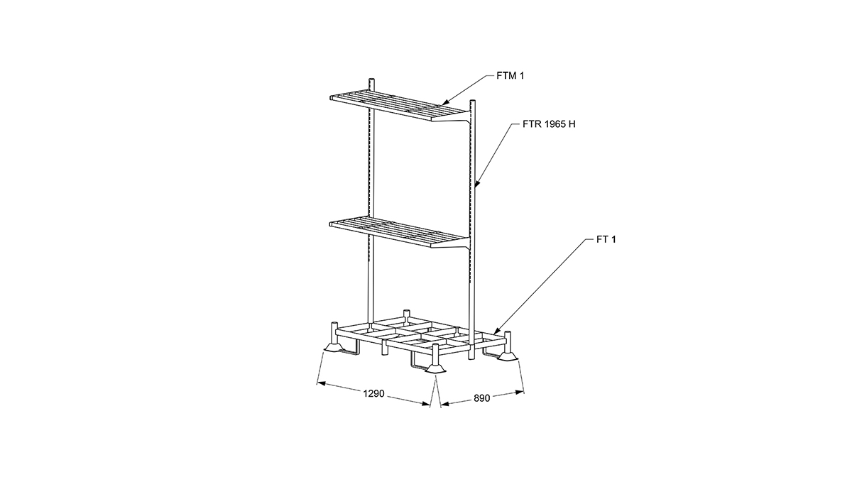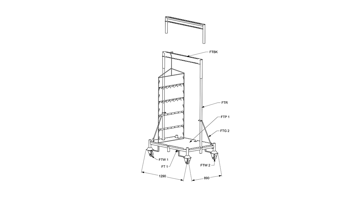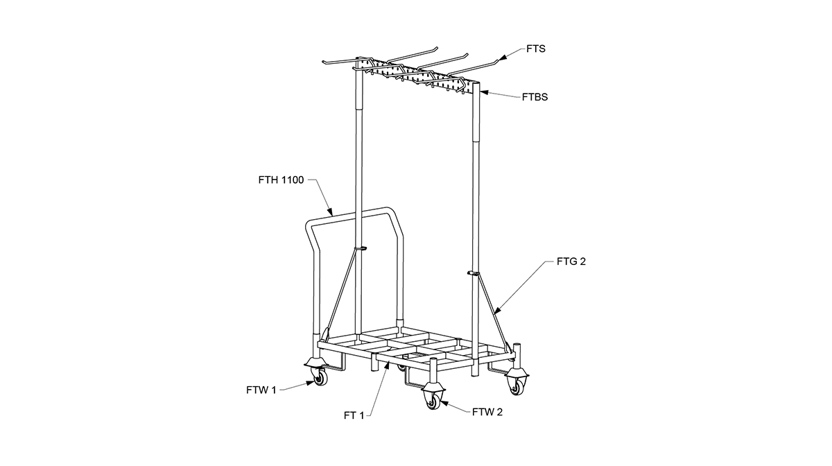 Estantes para almacenamiento y transporte de bastidores y ganchos.